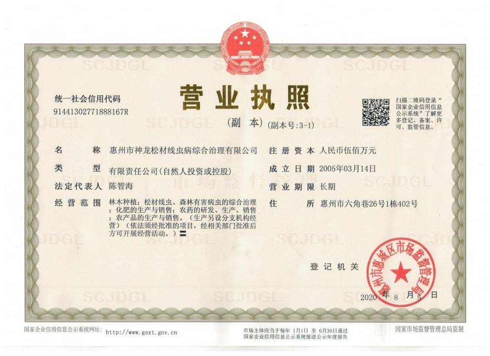 廣東神龍松材線蟲病綜合治理有限公司 廣東神龍松材線蟲病綜合治理有限公司于2005年3月14日注冊。公司創(chuàng)辦人陳紀文先生于1967年畢業(yè)于中南林學(xué)院(現(xiàn)為中南林業(yè)科技大學(xué))森林病蟲害防治專業(yè),數(shù)十年如一日,一直在基層從事森林病蟲害的研究與防治工作。為了挑戰(zhàn)松材線蟲病是不治之癥的誤辨,退休后組建全國第一家松材線蟲病工程治理專業(yè)公司,以松材線蟲病工程治理作為… 【詳細內(nèi)容】